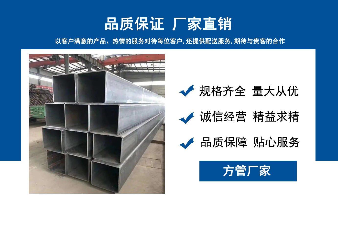 山東方管廠主要生產(chǎn)Q355B方管,Q355C方管,Q355D方管,Q355E方管,低合金方管等,曾多次為客戶解決了各種無(wú)縫管疑難問(wèn)題,經(jīng)不斷的創(chuàng)新與努力,得到了客戶良好的信譽(yù)和稱贊。  公司秉承質(zhì)量、服務(wù)是我們尋求發(fā)展的唯一途徑,為客戶提供極具市場(chǎng)競(jìng)爭(zhēng)力的高品質(zhì)產(chǎn)品,愿與客戶一起進(jìn)步、共享成功!  我公司秉承“誠(chéng)信經(jīng)營(yíng),服務(wù)周到”的經(jīng)營(yíng)原則,全力以赴,給客戶周到滿意的服務(wù)。“誠(chéng)信、專業(yè)、認(rèn)真、服務(wù)”是我們的宗旨。幾年來(lái)我們用專業(yè)的技術(shù)和周到的服務(wù)贏得了廣大客戶和供應(yīng)商的信賴,與各大企業(yè)有著廣泛的合作和聯(lián)系,受到了業(yè)內(nèi)好評(píng)。我們會(huì)以優(yōu)良的產(chǎn)品、優(yōu)惠的價(jià)格、優(yōu)先的貨期、優(yōu)良的服務(wù),珍惜客戶給予我們的每一個(gè)機(jī)會(huì)。...